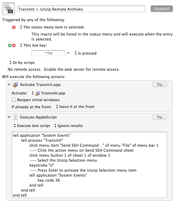 Note that the first line of the AppleScript above (tell application "System Events" to set frontmost of process "Transmit" to true) is gone. Instead, I use KM’s built-in ability to bring apps to the forefront. I didn’t have to do that, but I like using the capabilities in apps if I can. I set the key command to Ctrl-Shift-U, with the “U” short for “unzip”.